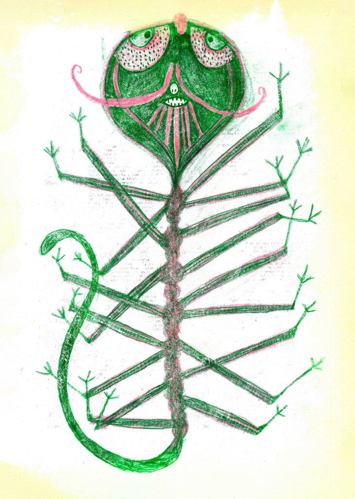 “we have no names we are no species we do what we do and we like what we do and we don’t need any of that you are this you are that you come from so and so no we don’t need that in the beginning we were born and we’re always changing always different that’s who we are sometimes we like this sometimes we like that none of us are the same and we always have room for more we fish we fly we crawl we eat we want what we want and some of us are sometimes fishes and sometimes flies sometimes swans and sometimes mosquitoes and we like to laugh even when we look angry even when we’re about to eat you boo! we’ll eat you and you can eat us too when the urge urges you we come and go when it’s our time as long as we’re here we’re having fun especially the way we are with these wings this hair these teeth that tail so long so short these plumes these eyes my oh my you’re beautiful in flight beautiful when you’re pooping come let’s poop here in the field plop plop poop who’s making dinner we’ll make dinner and eat anything as beautiful as we are anything as delicious as bright as sweet as sour sometimes we’re sour and bitter like cranberries like cocoa like kale as sweet as so much of the world is sweet look at us what’s not to love so when the artist came and said you look beautiful can I make your pictures we said sure he was nice we liked him he had lots of pretty feathers and shapes and we sat together and talked and shared stories from our heart and the artist with paper and pencils drew these portraits then he said these are for you and gave us the pictures so we did a drawing of the artist as a souvenir to take home which means we don’t have it here to show you sorry did you want to draw us too”